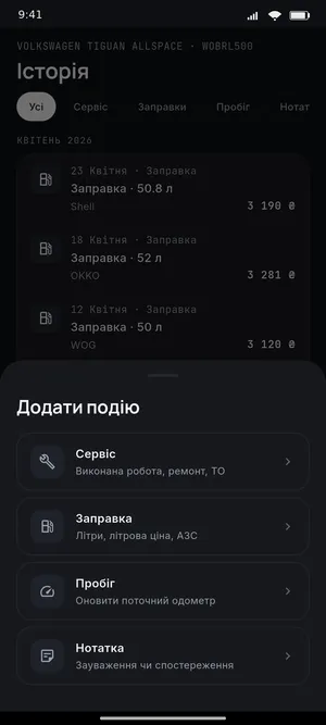 Сервіс, заправки, зарядки, оновлення пробігу, нотатки — усе про авто в одній стрічці.